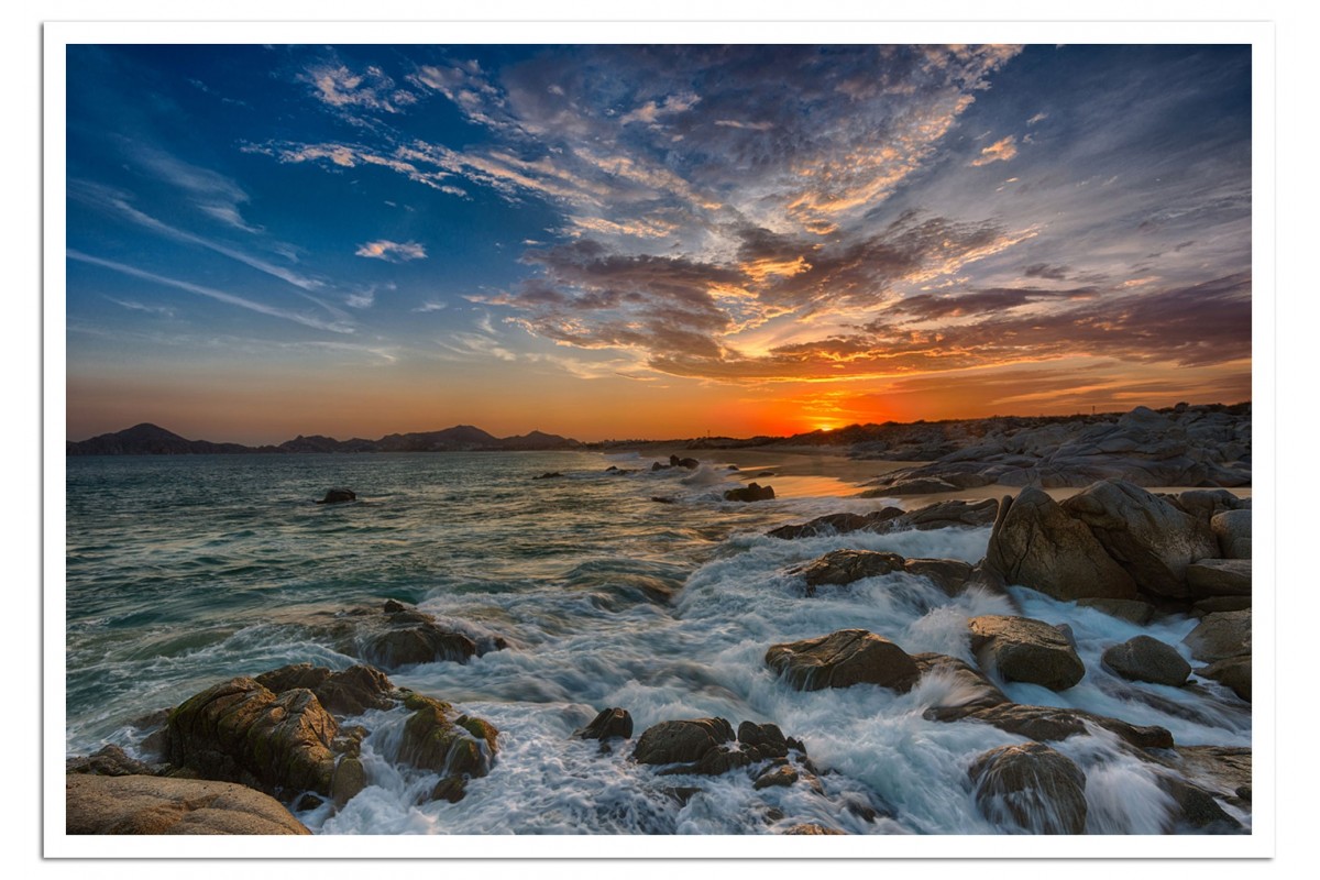 Ocean waves rush over rocks and on to a beach at sunset in Cabo San Lucas, Mexico.
