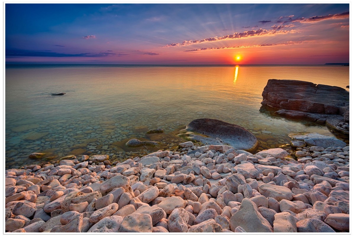 Large white rocks dominate the foreground at sunrise in Bruce Peninsula National Park.